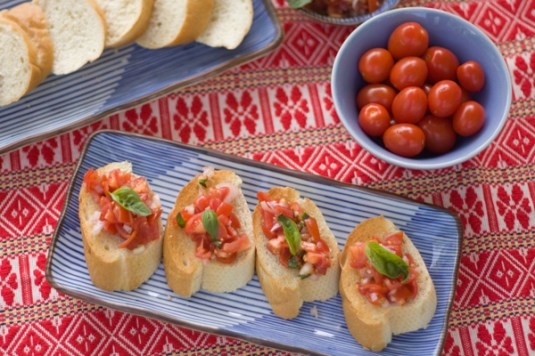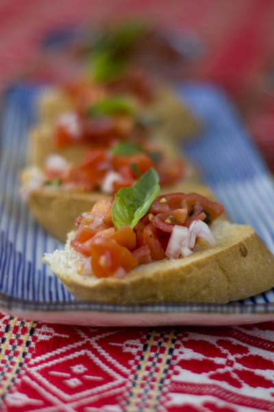 Bruschetta is a favourite of mine in the spring. The basil leaves and grape tomatoes are fresh, and I can sit on the porch, close my eyes and pretend I’m actually in Italy, and not in Canada where there’s a good chance the clouds will come out of nowhere and it will start hailing. This tends to happen when I’m heading outside in shorts, a tank top and have a scrumptious spread of food with multiple plates. Sigh.
