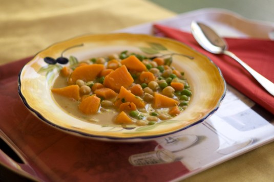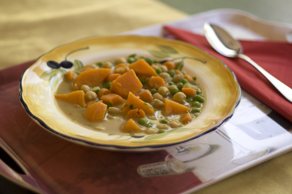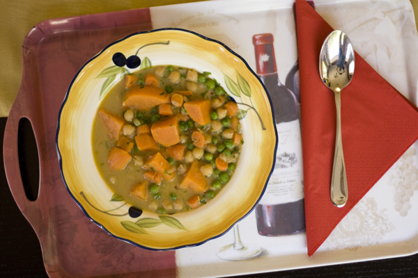 This recipe originally called for chicken. That’s not something you’re gonna find in our house, so we adapted it until it was delicious and still super filling. The peanut butter adds a lovely creaminess. The yam, peas and chickpeas are there to remind you that it’s healthy dish, even though it tastes like comfort food. It’s been cold, rainy and gloomy here, so this dish has been nice to dig into!